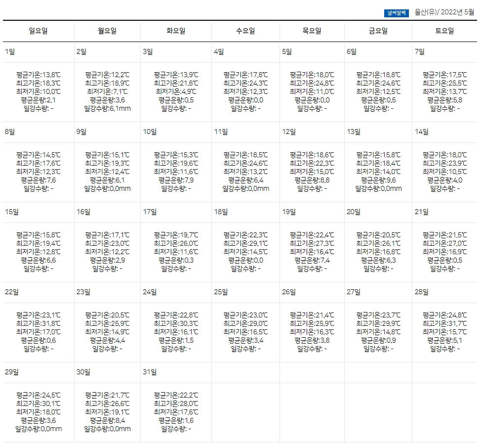 울산 5월 날씨 옷차림 비온날 최고기온